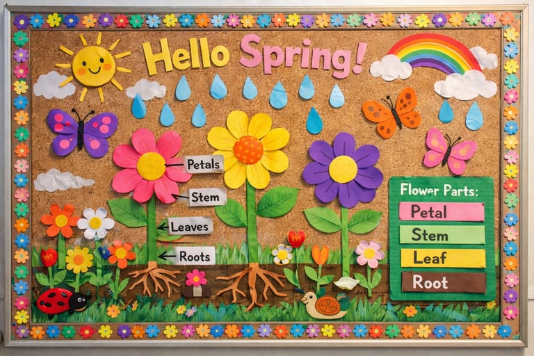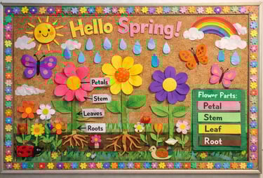 April marks the beginning of spring, and what better way to celebrate the season than with a nature-themed bulletin board? You can get your preschool to first-grade students involved by having them create flower cutouts, butterfly drawings, and even pictures of raindrops! This hands-on project not only encourages artistic expression but also enhances their understanding of the natural world around them. Use bright colors to represent the vividness of spring, and don't forget to label the different parts of the flowers to combine learning with creativity!