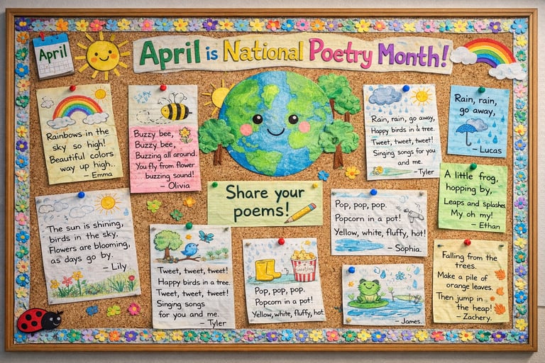Did you know that April is National Poetry Month? For this bulletin board idea, invite your students to write their own short poems or doodle illustrations that represent their favorite poems. They can be inspired by nature, weather, or even their daily experiences. Sticky notes work great for displaying individual contributions, allowing kids to share their thoughts in a fun and engaging way. This activity not only enhances their literacy skills but also fosters a love for poetry from a young age!